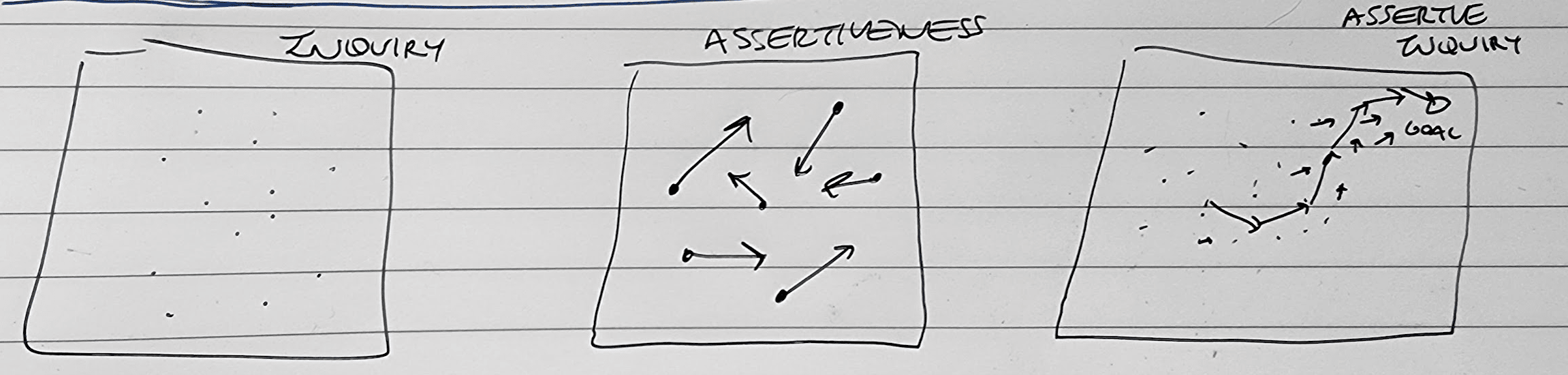A useful analogy is to think of it like driving: - Inquiry alone is where you ask questions about where to go, but don’t move. - Assertiveness alone is where you drive without care; possibly going over a closed bridge because you ignored the signs. - Assertive Inquiry is like using Google Maps; you’ve got a destination in mind, and the route adjusts based on conditions.