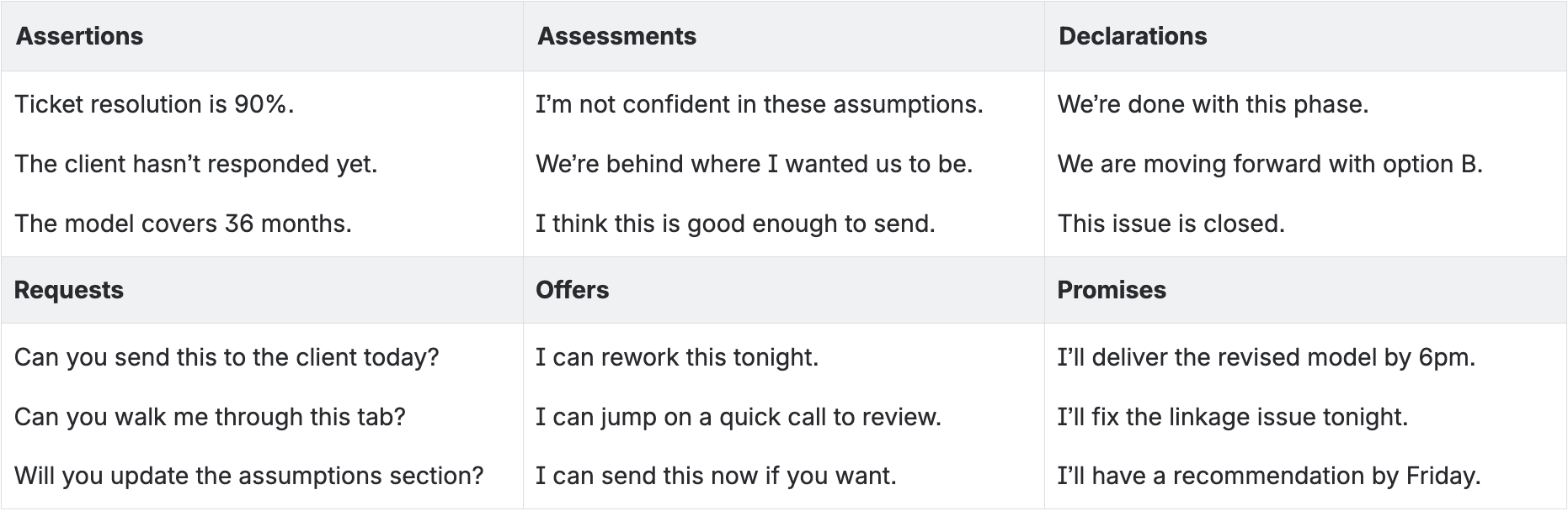 Every business update should answer three questions explicitly: 1. What is happening? (assertion) 2. So what? (assessment) 3. Now what? (request / offer / promise / declaration)