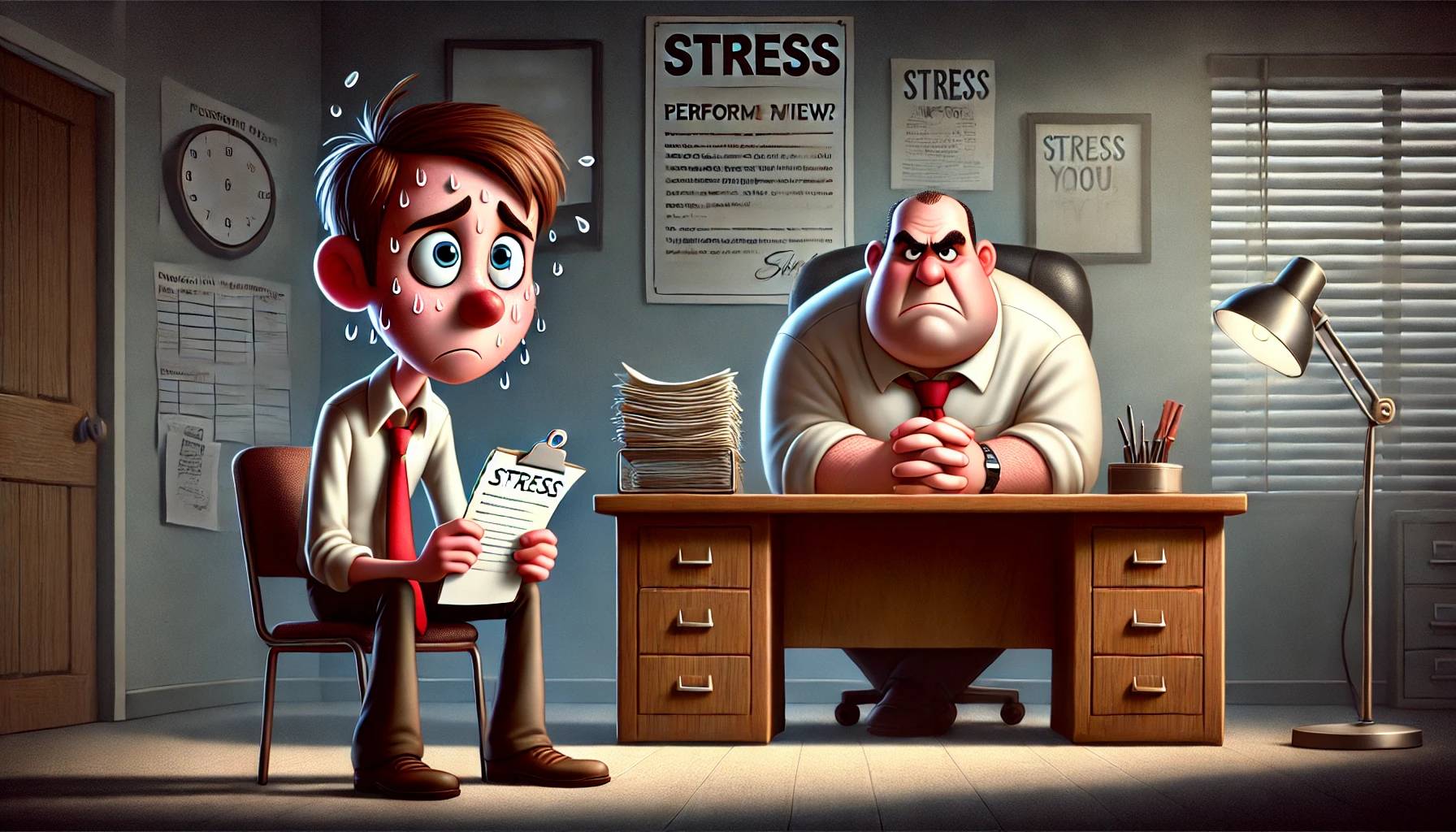The signs on the bosses wall that say "stress" sure aren't helping.
