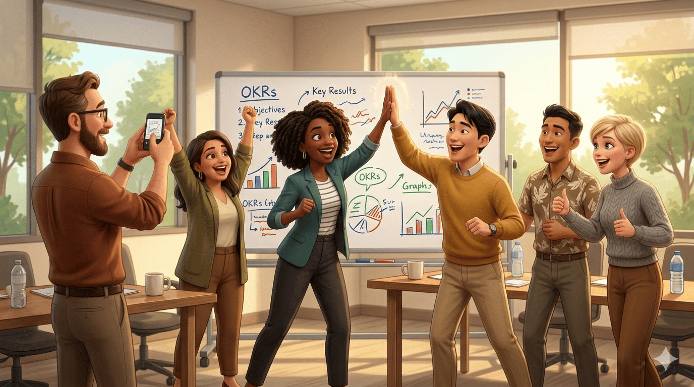 You did the hard thing. You wrangled leadership. You fought through the abstract conversations, and you landed on objectives and key results (OKRs) that mean something. Energy is high. People are smiling with a mix of relief and excitement. Someone takes a photo of the whiteboard. You did it!